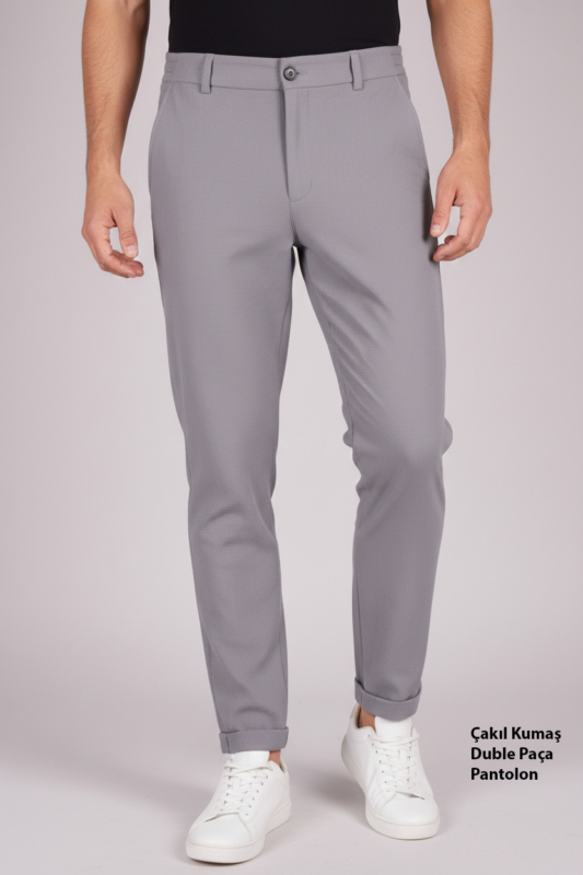 Erkek Çakıl Kumaş Duble Paça Pantolon Slim Fit