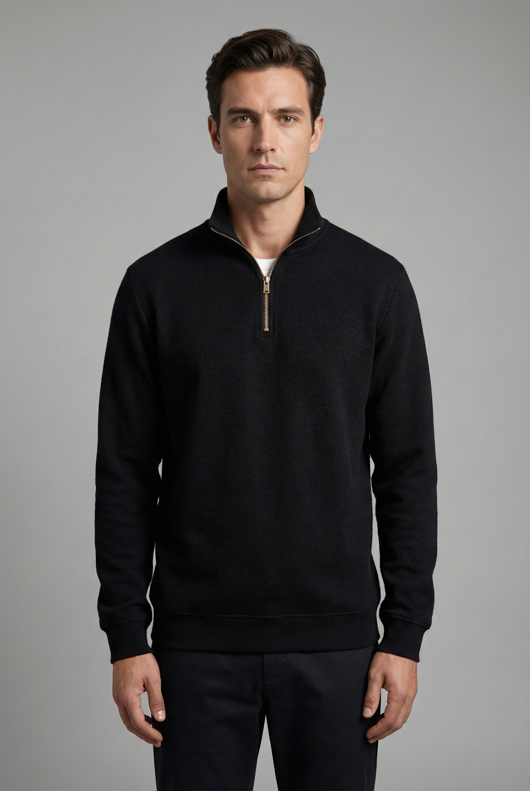 Slim fit kesimi ve yarım fermuarlı dik yaka tasarımıyla öne çıkan erkek siyah sweatshirt, zamansız ve modern görünümüyle günlük ve smart casual kombinler için ideal bir tercihtir.