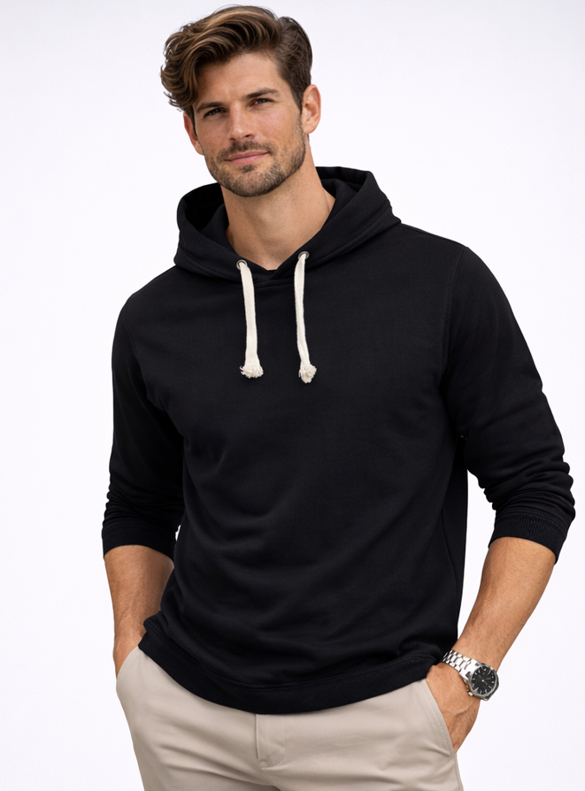 Premium siyah kapüşonlu erkek sweatshirt, sade tasarımı ve modern görünümü ile günlük giyimin vazgeçilmez parçalarından biridir. Minimal tasarımı sayesinde hem spor hem de casual kombinlere kolayca uyum sağlar.