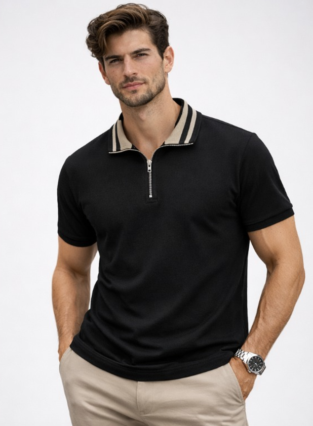 Siyah Yarım Fermuarlı Polo Yaka Erkek Tişört
